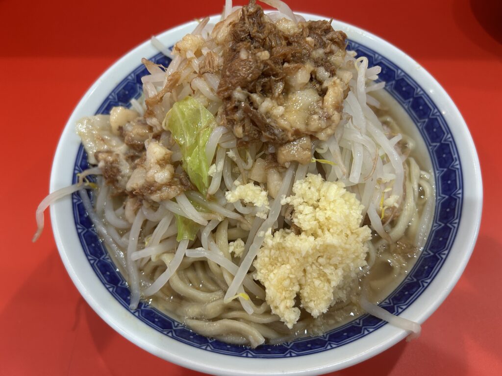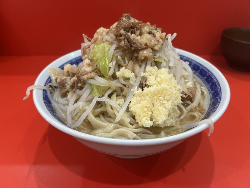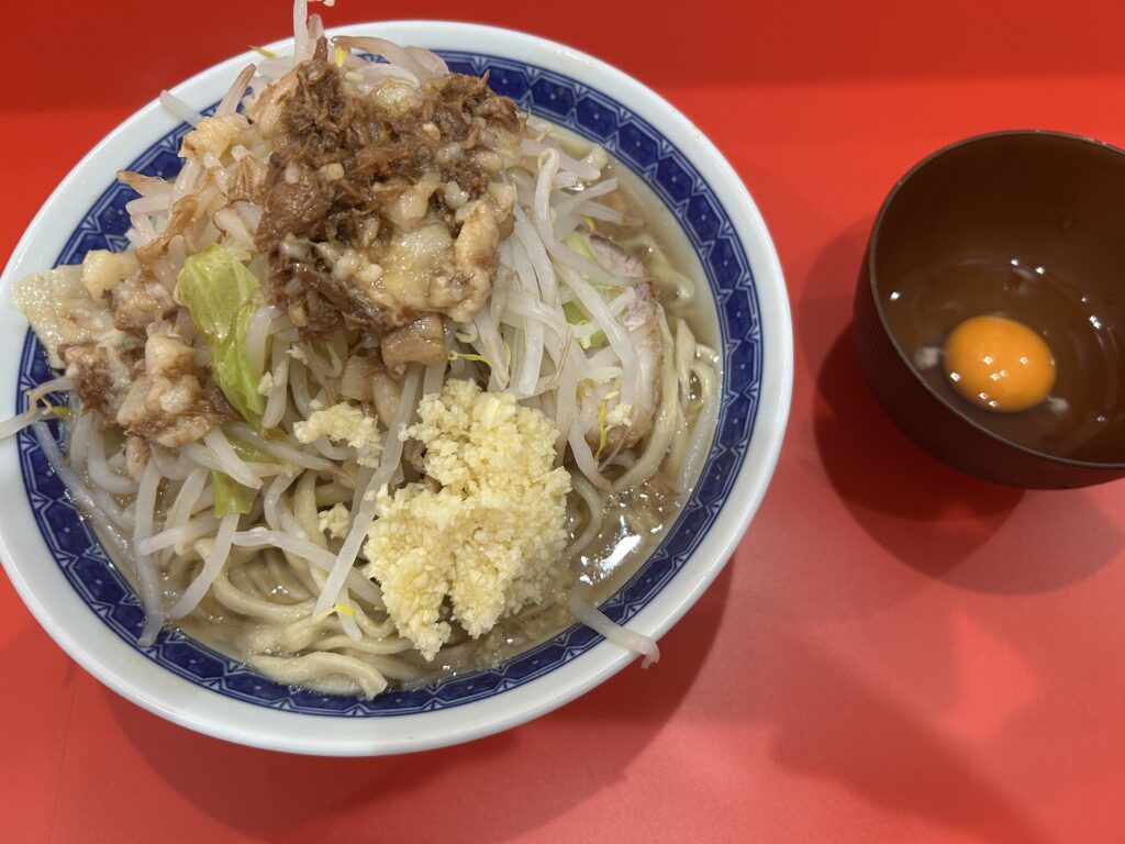 <大ラーメン(にんにくマシマシ、脂マシマシ、からみマシ)+生卵>
