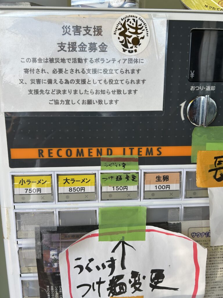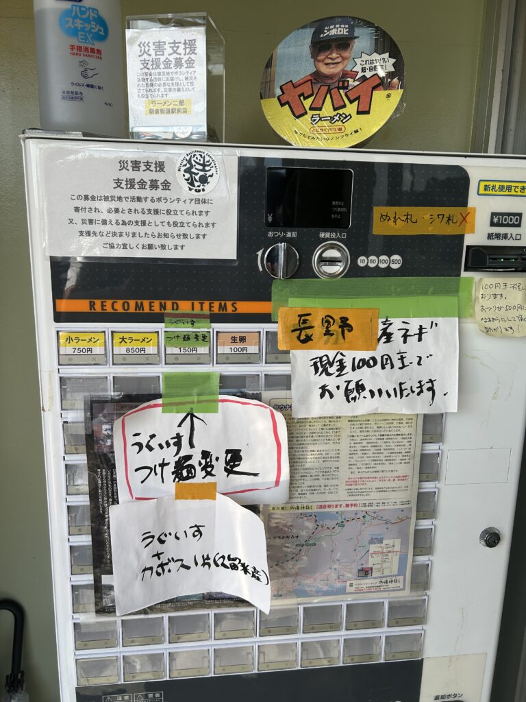 11:32分くらいにようやくシャッターが開いて開店です。まずは店舗外の自販機で食券を購入して入店。店内には、坊主で眼鏡をかけた物静かな感じの男性店主と、そのお母さんなのかパートの方なのか、ラーメン二郎にはいそうにない高齢の女性が厨房に居て、女性の方が座る席を指示(奥から順番に座るルール)します。私はてっきり、店内には5席しかないのかと思ってましたが、実はカウンター10席と、あとは次の5人待機用の椅子が壁際に5脚(カウンターで食べている人の後ろにあるので、ずっと食べている状況を後ろから見られている感じ)あります。