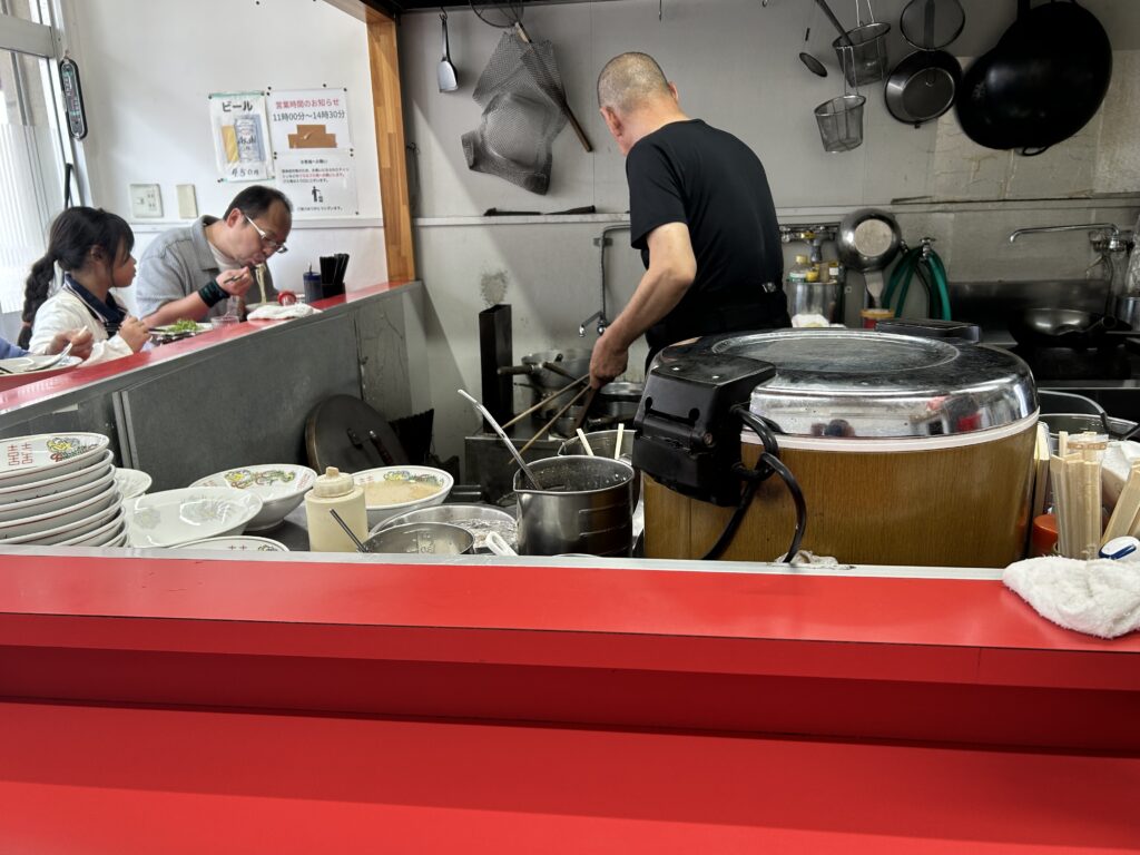 麺が残り少なってきたので替玉を注文。麺は茹でた後、湯切りザルでお湯を切ってそのまま丼にダイレクト入れてくれます。さあ再び食べ始めようとしたら、ご主人が再び近寄ってきて、新たに大量のネギを追加で丼に入れてくれました。すごいサービスだなと思いました。