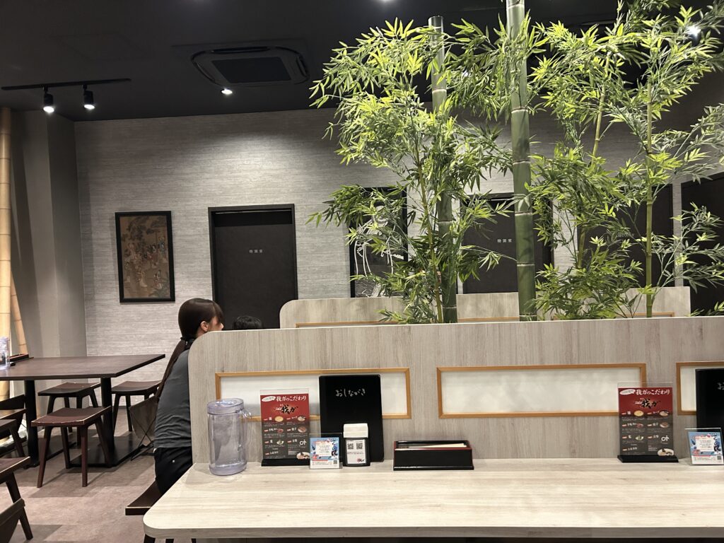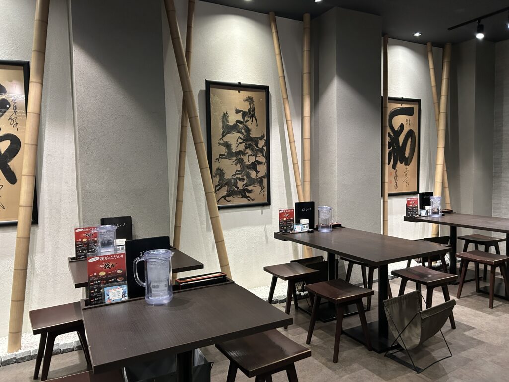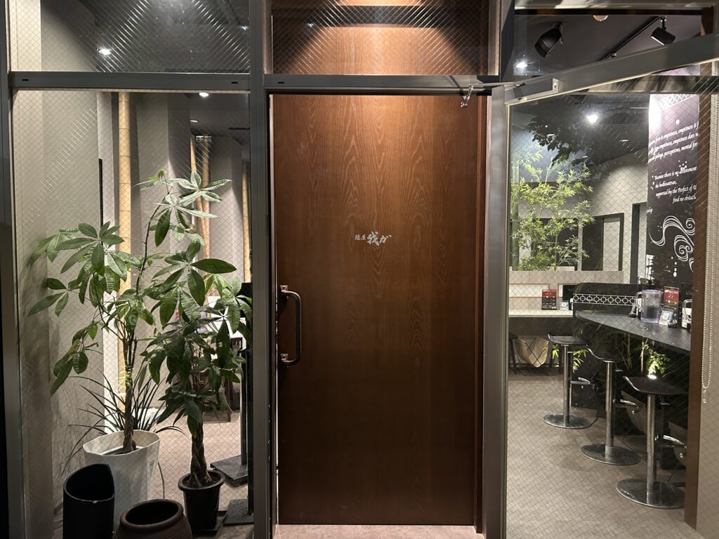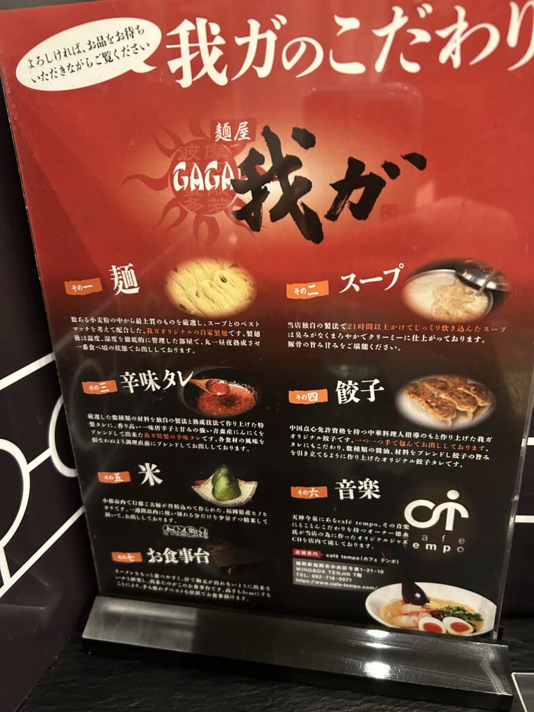 最後に辛味タレをかけるのが特徴の小郡発祥とんこつラーメン。その中でも有名なお店『我ガ』。数年前に「ついにあの我ガが福岡市にやってくる」と話題になってましたがようやく訪問しました。外観も店内も、ラーメン屋さんとは思えないお洒落な店舗です。