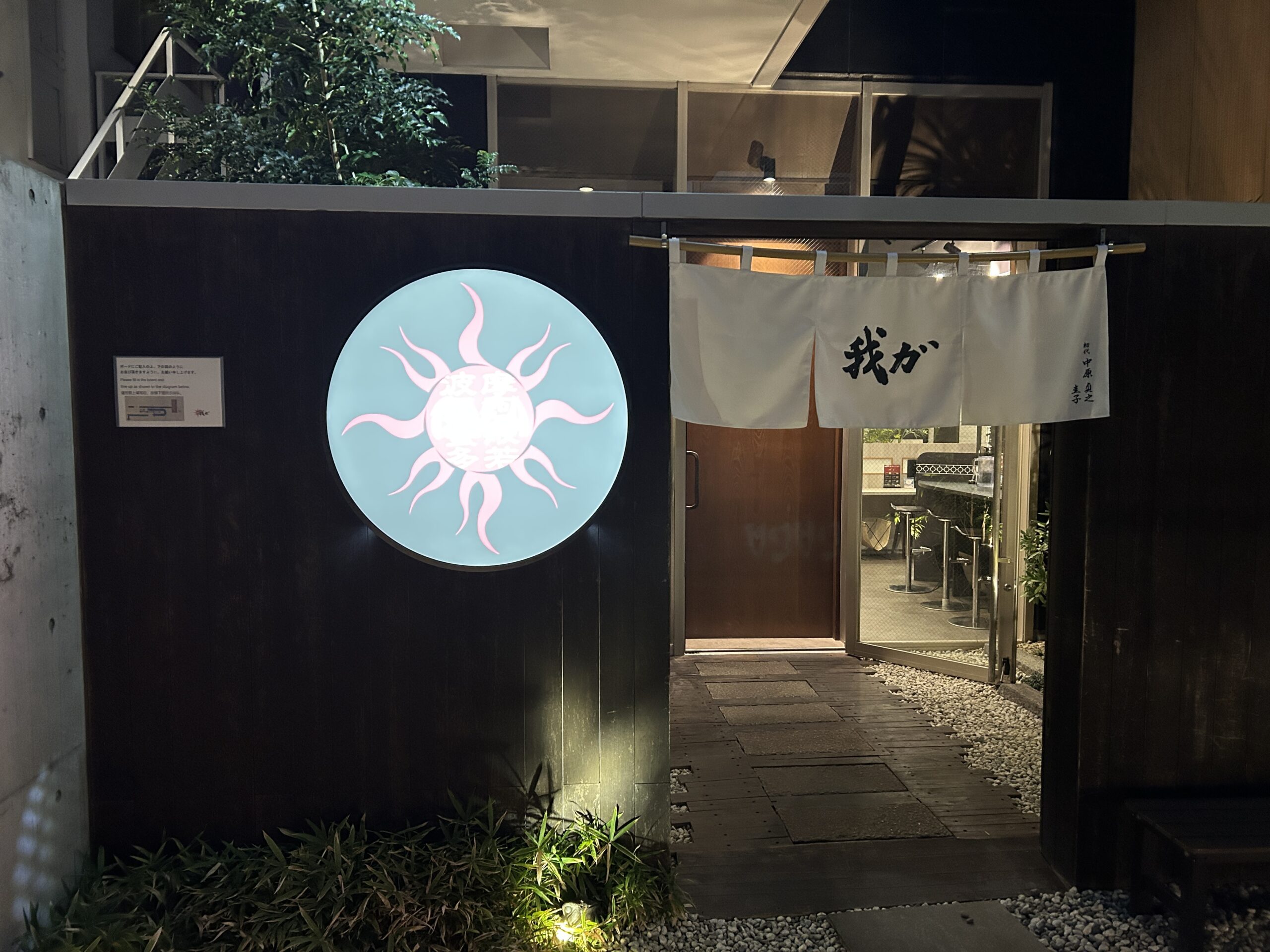 最後に辛味タレをかけるのが特徴の小郡発祥とんこつラーメン。その中でも有名なお店『我ガ』。数年前に「ついにあの我ガが福岡市にやってくる」と話題になってましたがようやく訪問しました。外観も店内も、ラーメン屋さんとは思えないお洒落な店舗です。