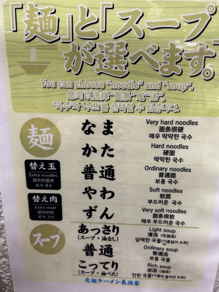 麺の硬さを選べるのは当然ですが、注文時にスープ(あっさり、普通、こってり)も選べます。注文は店員さんに口頭で行いますので、注文時に麺の硬さとスープの種類を伝えましょう。