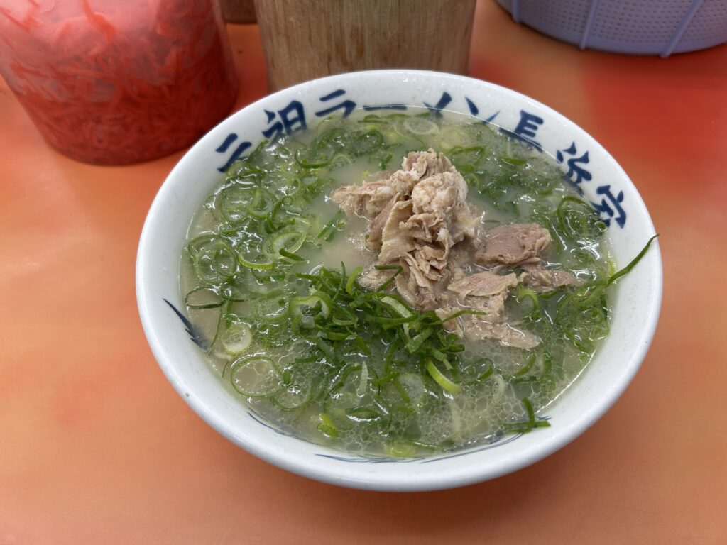 まずスープは特にしていせず、普通を選択したのですが、あっさり薄目の豚骨スープです。しかし、絶妙な旨味が心地よく感じます。あっさりなのに味に物足りなさを感じず、コシの強い細麺との相性も抜群です。食べた瞬間に感動する旨さというわけではありませんが、食べてても飽きがこず、ずっと食べていたいラーメンです。更に、食べてから何日かすると、また食べたいなと思い出させるような不思議な美味しさです。人気店というのも納得です。そして、チャーシューが1枚2枚でなく、シーチキンみたいなチャーシューの細切れを一掴みドンと乗せてあるのも面白いですし、それがまた美味しかったです。そして、ラーメン500円という激安価格なのに、ネギの量が半端なく多くて、このサービス精神には感服しました。